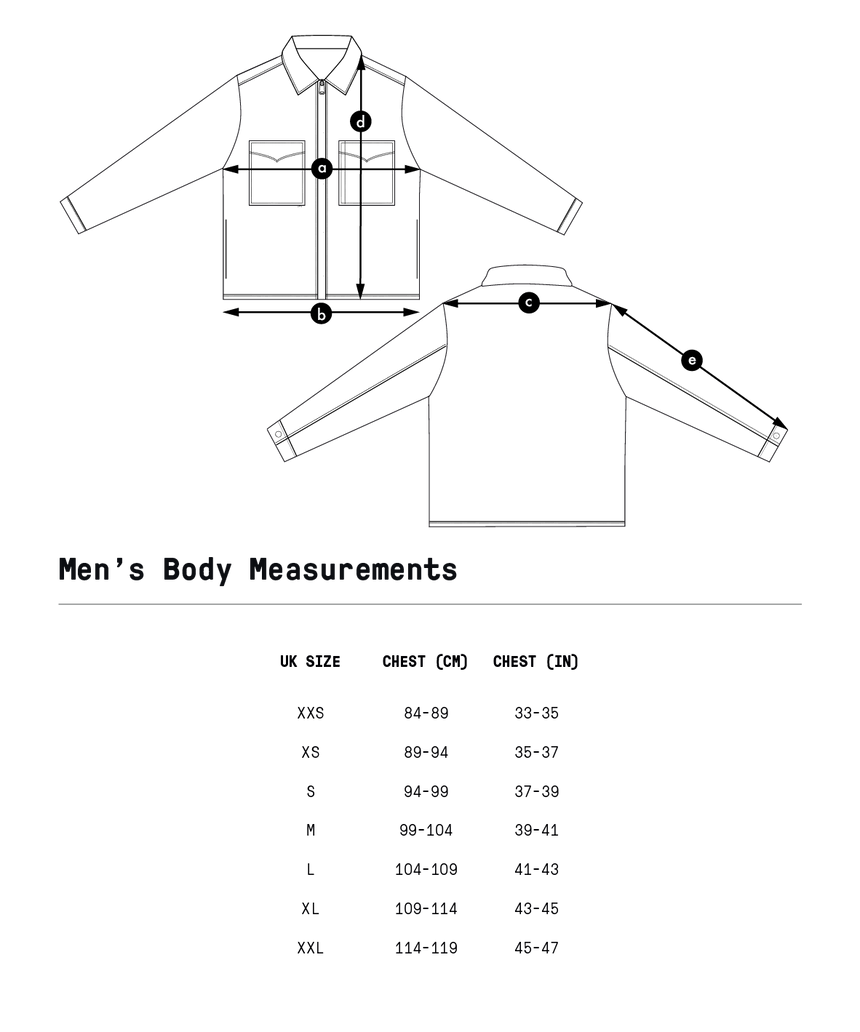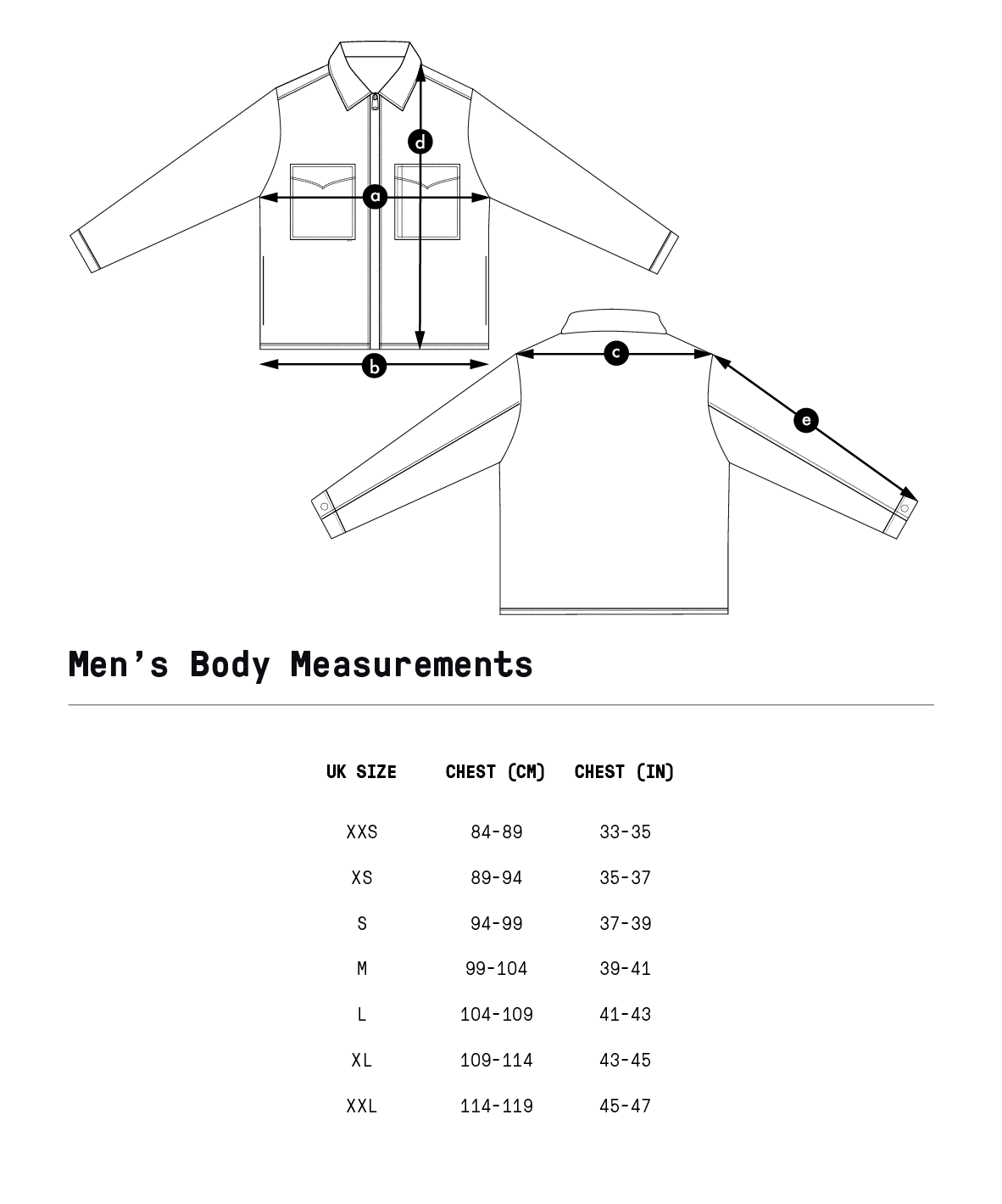 SizeChest (a)Hem (b)Shoulder to Shoulder (c)Length (d)Sleeve Length (e)