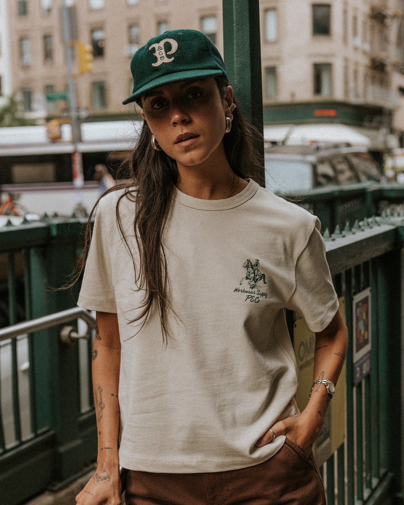 The Workwear Supply T-shirt in bone is a regular fit women's graphic t-shirt, made from a mid-weight soft cotton jersey. The classic crewneck features hand-drawn graphics screen-printed on the front & back. The organic cotton used to make our tees, is grown without pesticides or synthetic chemicals. On average, 62% less energy and 91% less water is used- producing 62% less CO2 compared to standard cotton.