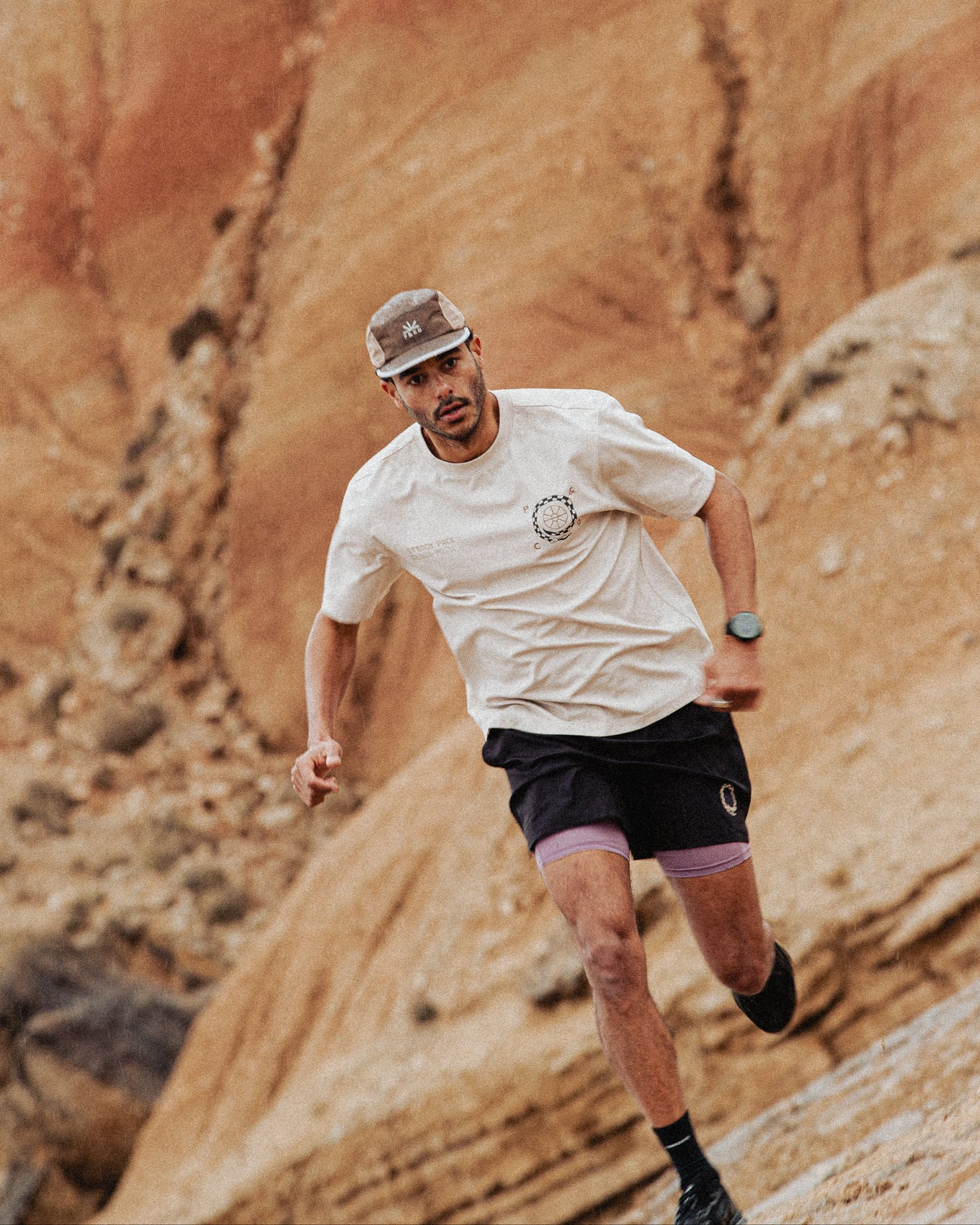 The Steady Pace Trail T-shirt in bone combines activewear performance with a hand-drawn graphic style. This activewear tee was made to move, constructed from a blend of cotton, polyester, and spandex for comfort and flexibility. The perforated fabric panelling at the sides and under the arms ensures breathability, while the reflective graphics will keep you visible on the trail.